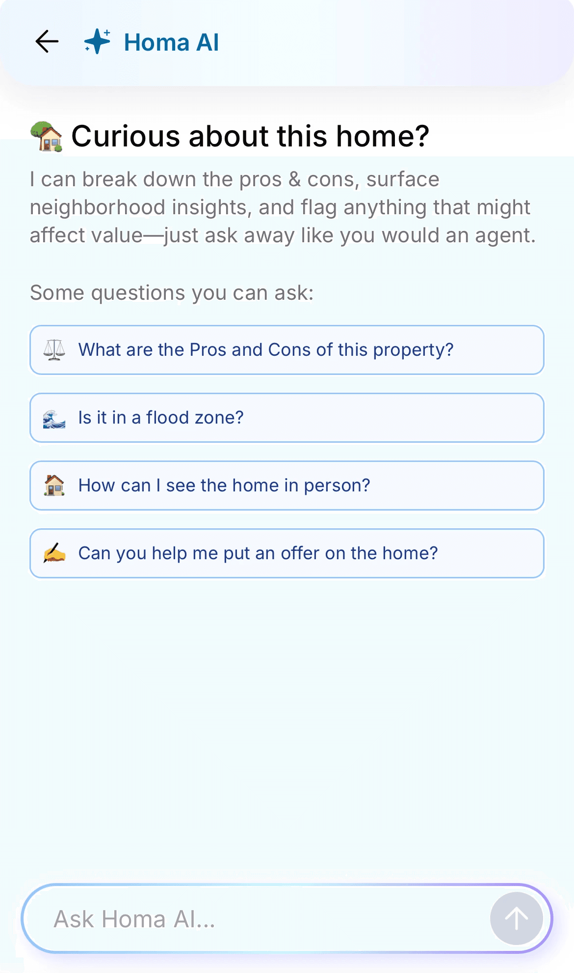 Get data-driven insights and Homa’s AI assistant to research any home you’re interested in.